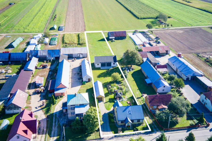 Duża, prostokątna działka o powierzchni 3800 m² i wymiarach ok. 23 × 165 m jest ogrodzona i zadbana.